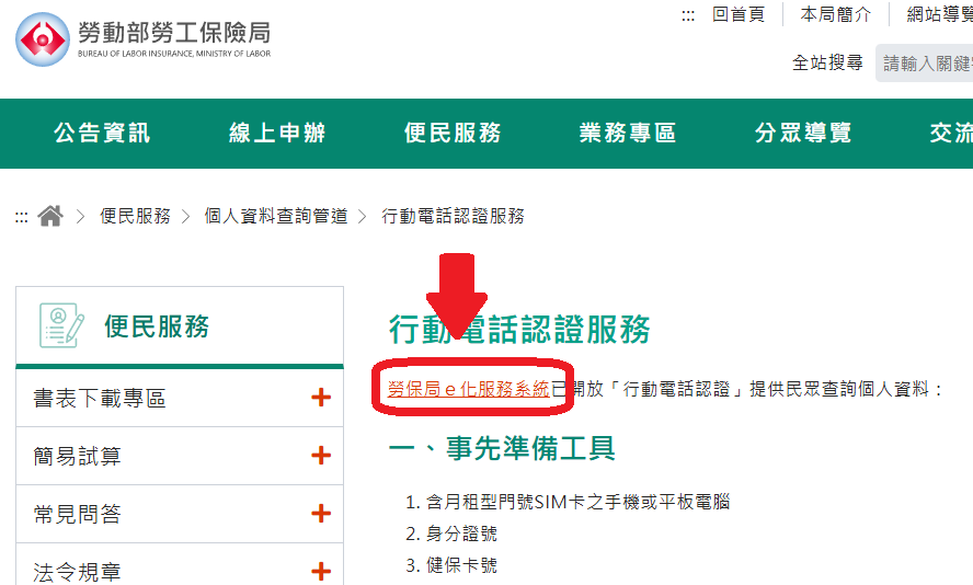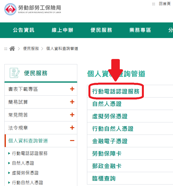 前往勞保局的「個人資料查詢管道」頁面,七蛙選擇最方便的「行動電話認證服務」。