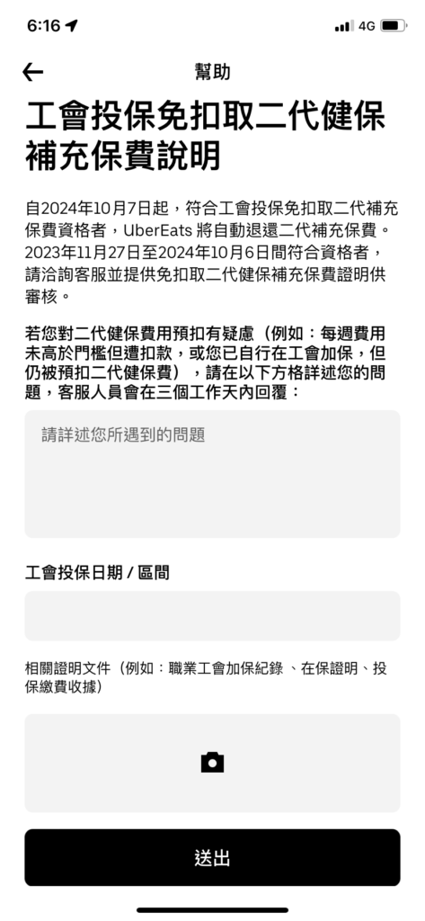跑UberEats的小夥伴可以透過Uber Driver 夥伴端App中「幫助」>「費用問題」>「二代健保補充保費相關問題」來上傳加保紀錄 (直接跟工會索取即可)。