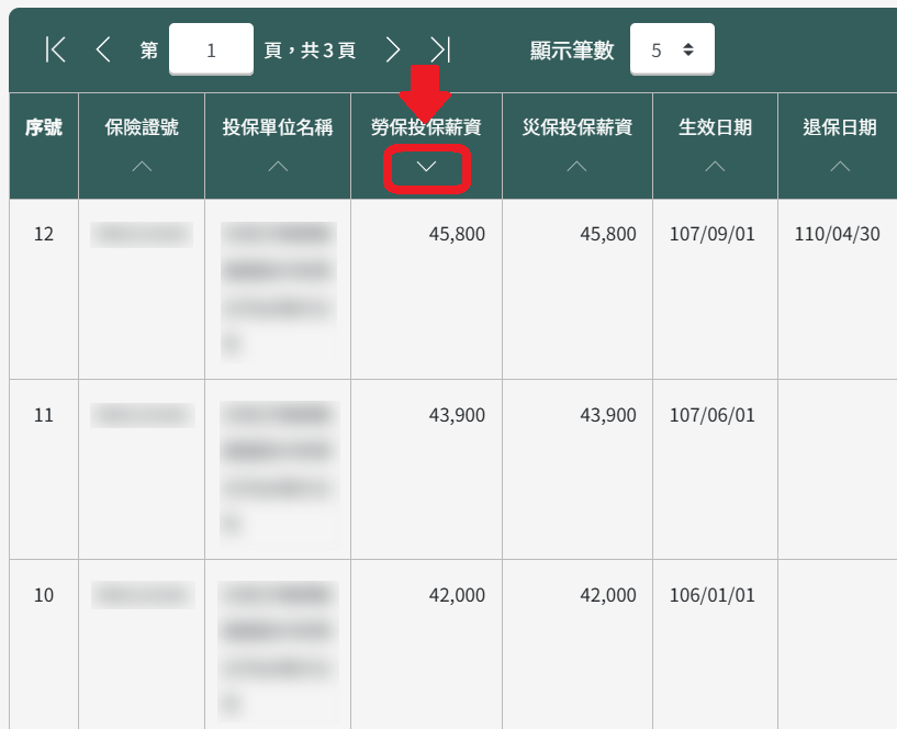 我想看自己的投保薪資,從高到低,所以我在「勞保投保薪資」的「∧」符號點兩次,讓它變成「∨」,就會從高到低顯示。